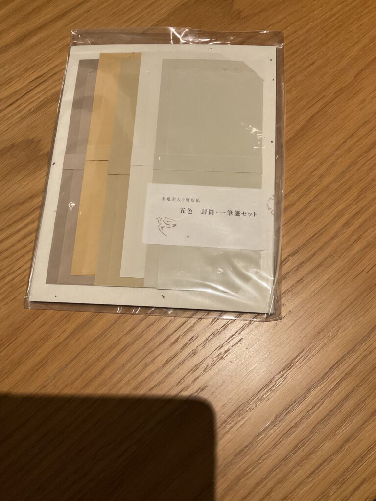 ちなみに泥の色はこんな感じ。お土産に買った封筒セット。国産雁皮100パーセントだからツルツルした感じ。