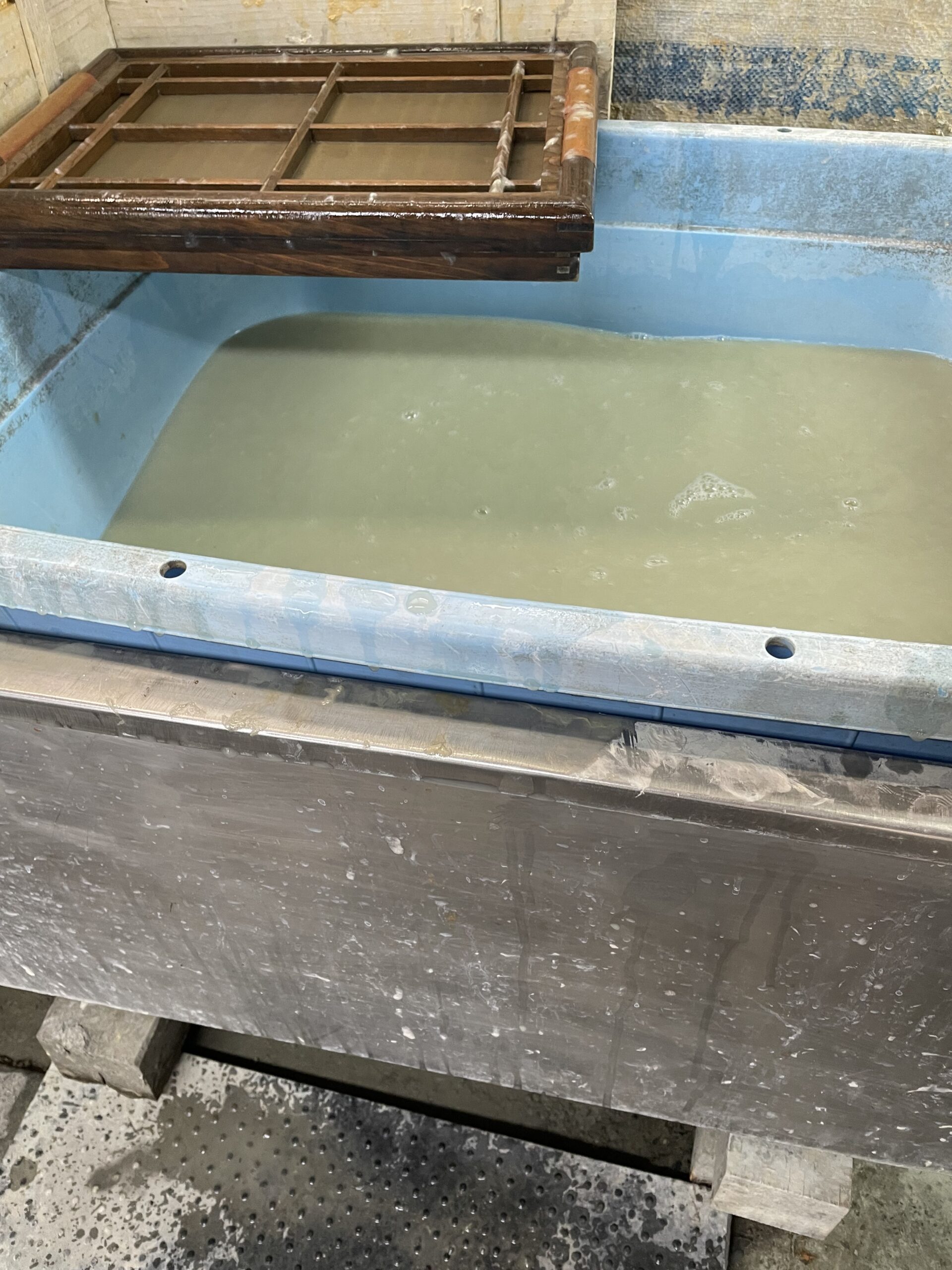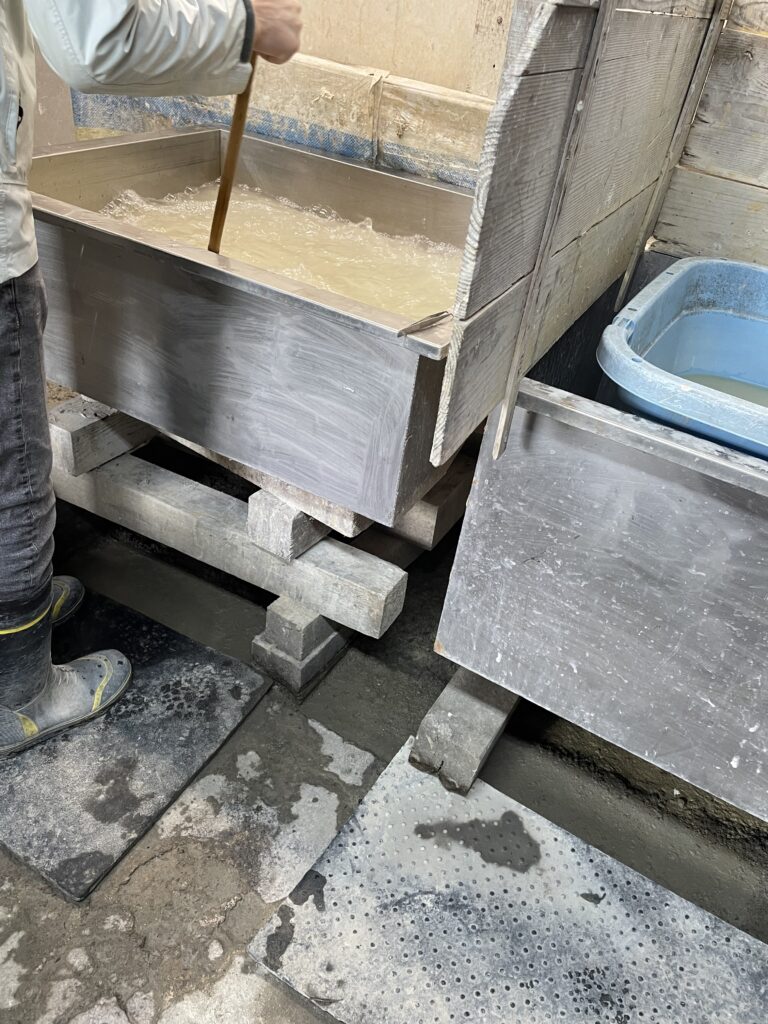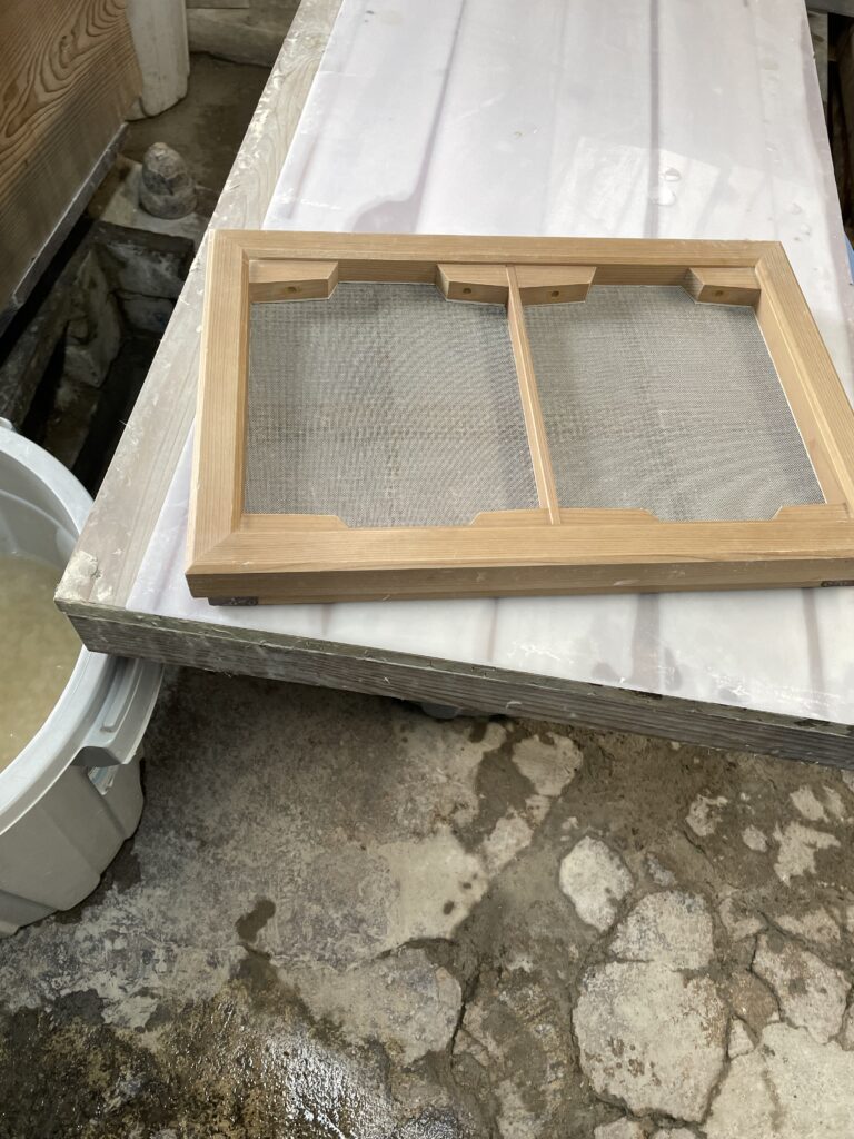 材料の性質ゆえ……という説明だったかと思うが、こたらではチャプチャプ揺らす流し漉きではなく、揺らさずに持ち上げて液体が切れるのを待つ溜め漉きである。