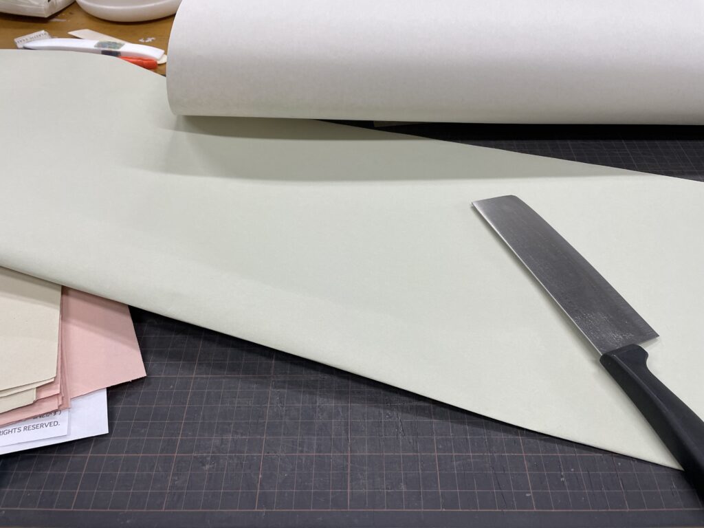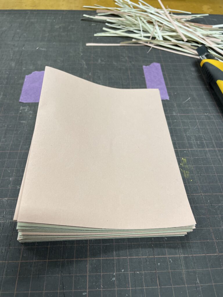 まず538✖️810の大きな色つきの更紙四枚をペーパーナイフで荒裁ちして、全部で四十枚の紙片に。この本文となる更紙は、表紙に合わせてやわらかい紙とのこと。
