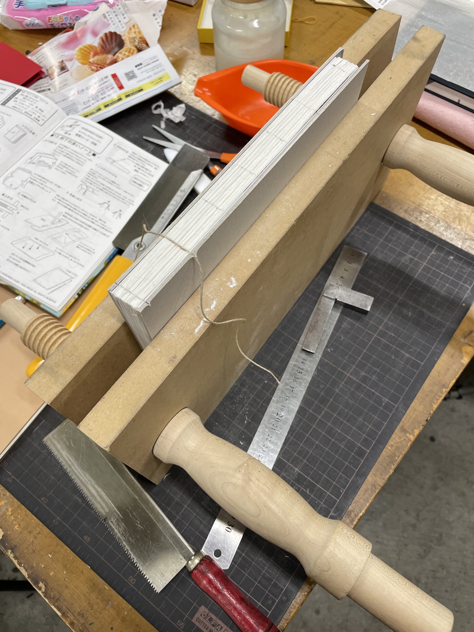 糸でかがる位置を計算して、細い鋸、太い鋸でかがる位置を削って目引きする。