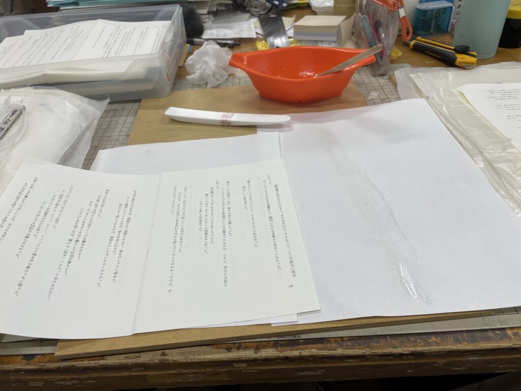 バラしてプレスした本のページ中央に補強の薄い和紙を貼っていく。