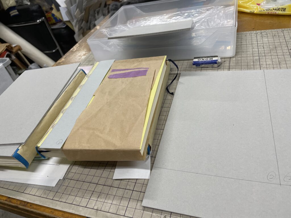 本の形に合わせて切り出したボール紙に革をくるんでお願いするか、それとも自分で位置を測定してお願いするか。
