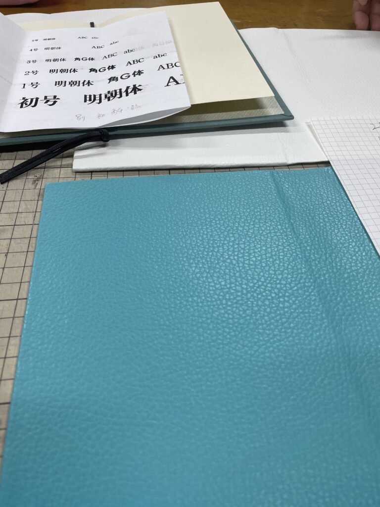 箔押し文字を入れるタイトル、その位置、フォントの大きさ、箔の色の指示書を先生と相談しつつ仕上げる。